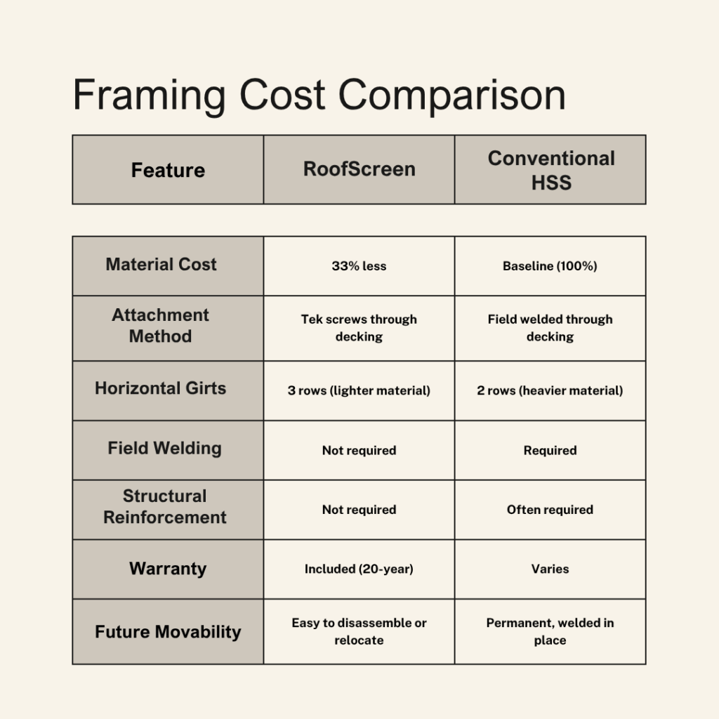 In a direct comparison on a high-occupancy City Hall project located in a moderately high wind zone, RoofScreen’s heavy-duty frame system delivered a 33% reduction in framing material costs compared to a traditional HSS approach.