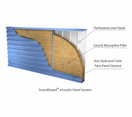 The SoundGuard® Acoustical Panel System is a sound attenuating barrier assembly designed for aesthetics as well as noise control. The outward facing panels of the system can be any desired material allowing uniformity of color, texture and profile with other elements of the building.
