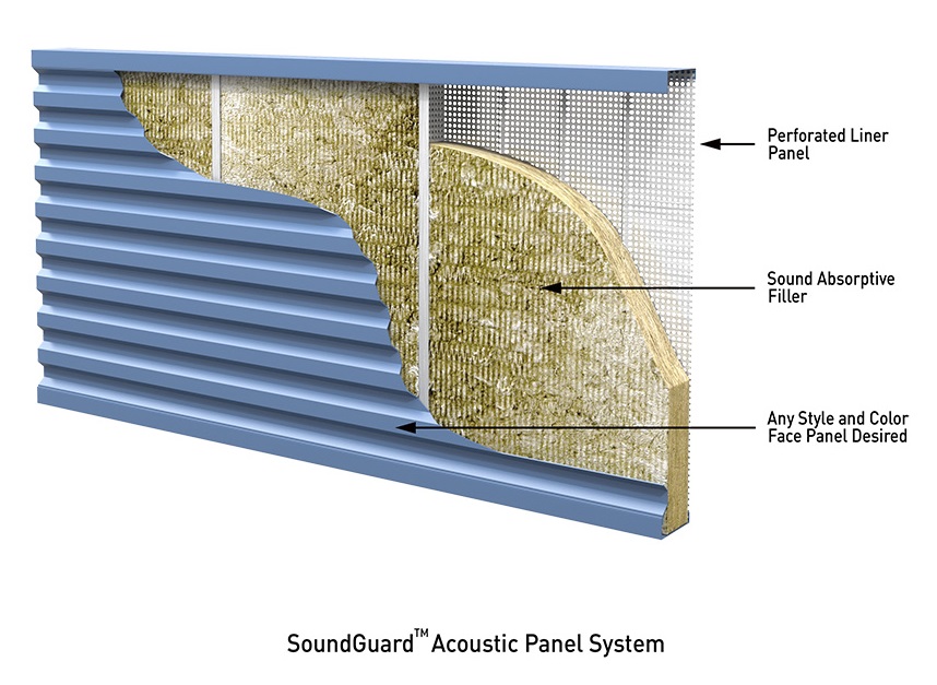SoundGuard® panels are engineered with an absorptive core of mineral wool insulation, secured between a perforated liner and a customizable exterior face panel. This configuration allows sound to pass through the perforations and be absorbed rather than reflected, reducing both the volume and harshness of mechanical noise. The outward-facing metal cladding provides a clean, customizable architectural finish.